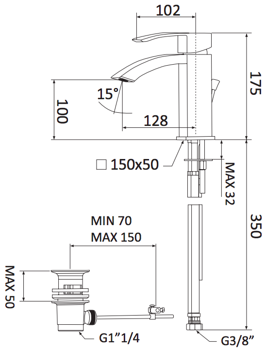 1) Смеситель для раковины Mariani Marte однорычажный с донным клапаном каскадный излив хром