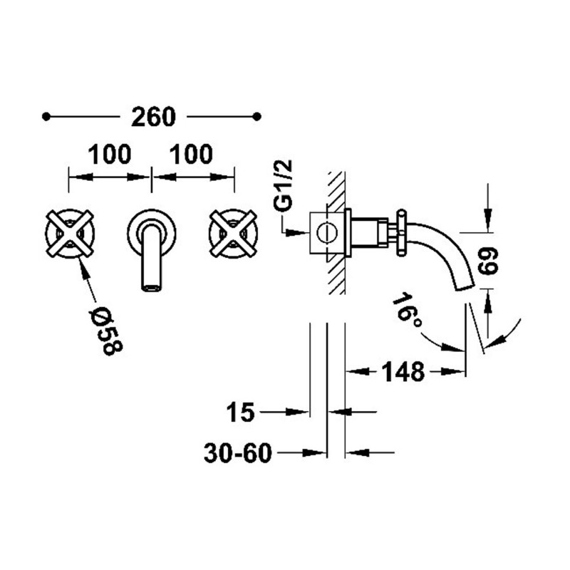 Смеситель для раковины Tres Mont Blanc двухвентильный настенный сталь 28330001AC