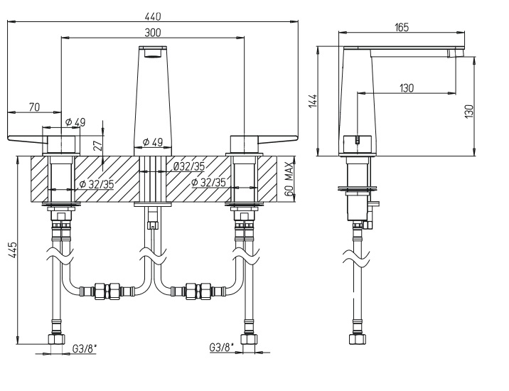 Смеситель для раковины Villeroy & Boch Conum на 3 отверстия матовое золото