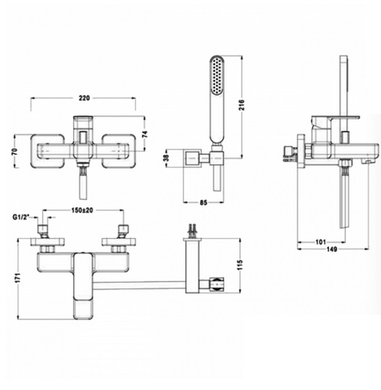 1) Смеситель для ванной Eurorama Tono с душевым гарнитуром хром