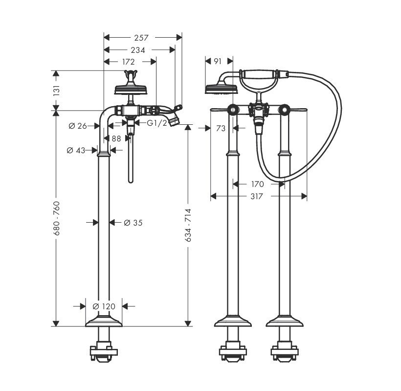 - смеситель для ванны с двумя рукоятками напольний, ручной душ, шланг для душа, держатель для душа