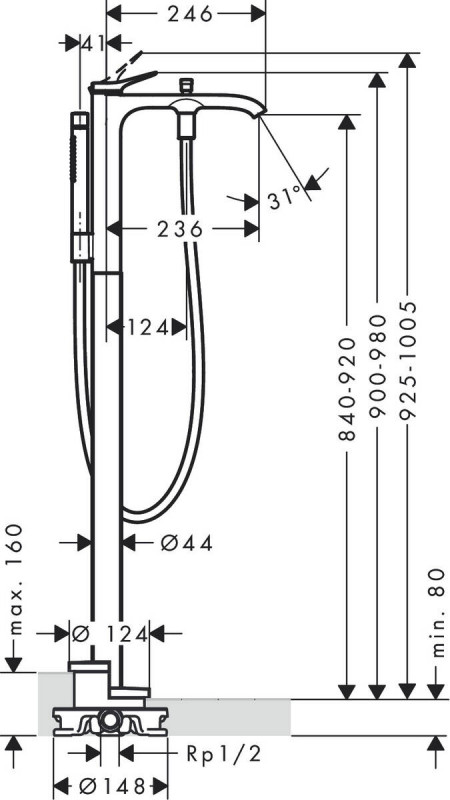 - состоит из: однорычажный смеситель для ванны напольный, ручной душ, душевой шланг, держатель для душа