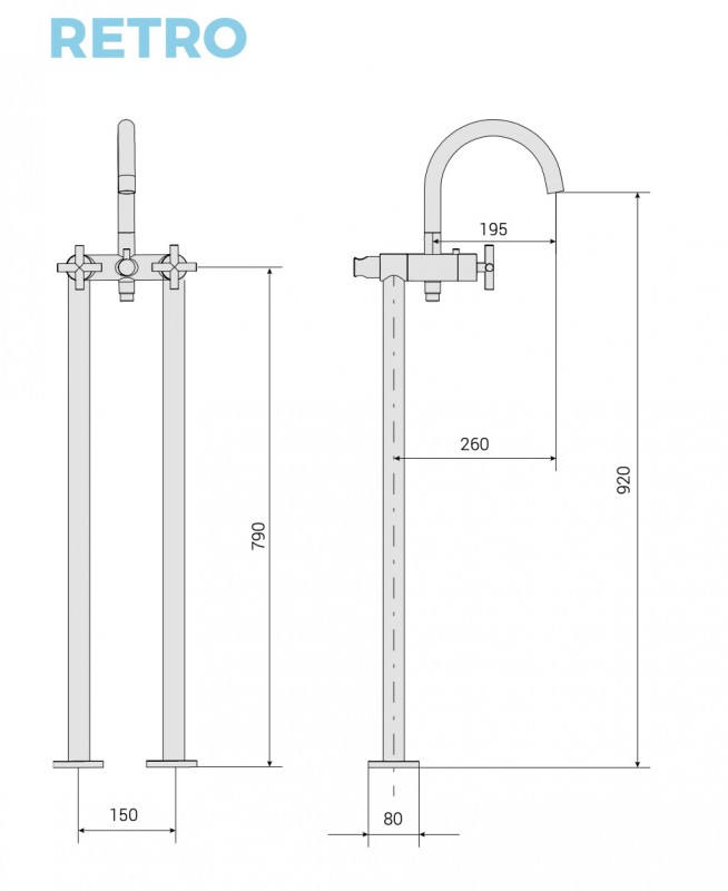 - Вид: напольный двухвентильный смеситель для отдельно стоящей ванны