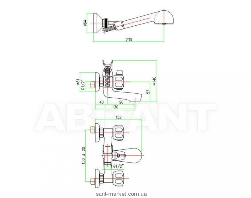 Смеситель для ванны в комплекте с ручным душевым шлангом, настенным держателем