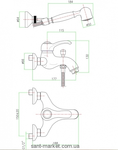 с ручным душем, настенным держатеем душа и душевым шлангом 1,5 м
