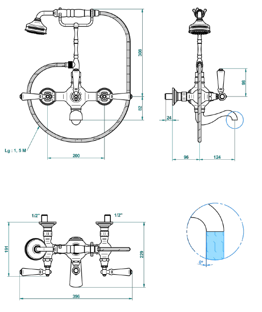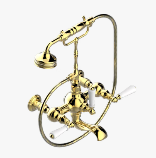 1) Смеситель для ванной THG Broadway a Manettes двухвентильный с ручным душем и шлангом золото