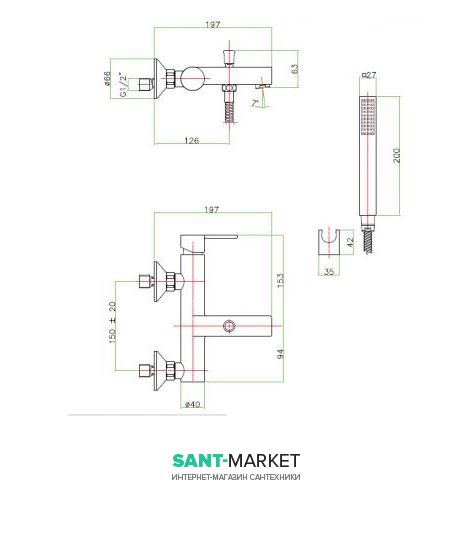 Смеситель для ванны Fiore KATANA с ручным душем шлангом и держателем хром 77CR7550