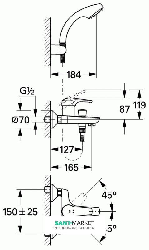Смеситель однорычажный с душем для ванны Grohe коллекция Eurosmart New хром 33302002