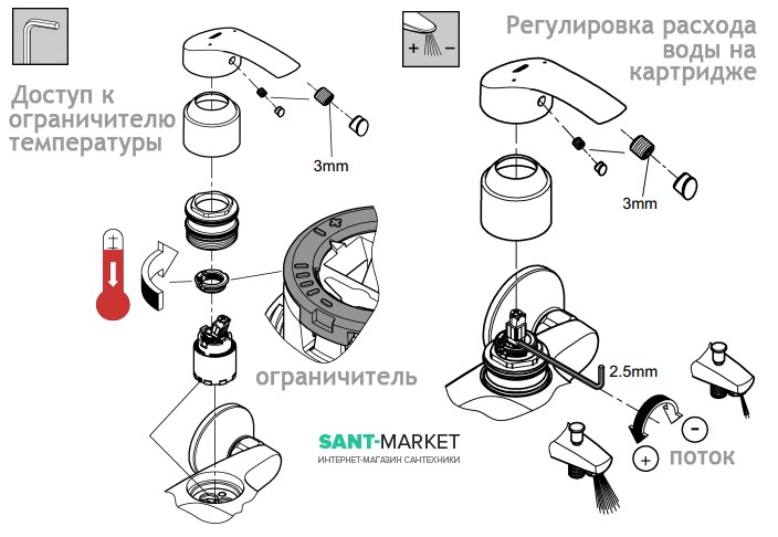 В поставляемом состоянии ограничитель температуры не активирован, действия по активации представлены на схеме. Для того чтобы добраться до ограничителя, нужно снять металлическую рукоятку: аккуратно поддеть булавкой силиконовую заглушку, шестигранным ключом 3мм выкрутить крепежный винт и снять ручку вверх. Установите ограничитель в нужном положении, поставьте ручку смесителя в обратном порядке.