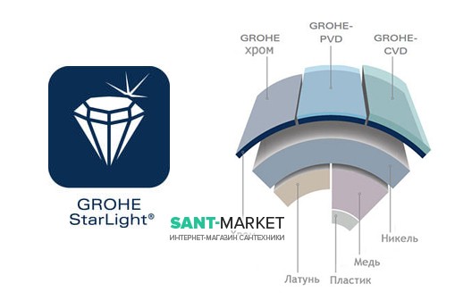 Смесители просты в обслуживании и уходе, покрытие GROHE StarLight ослепительно блестит, акцентируя внимание на интерьере вашей квартиры. Покрытие смесителей выполнено по специальным технологиям и обеспечивают стойкость к износу. GROHE гарантирует, что смесители прослужат много лет и будут выглядеть так же прекрасно, как и в день покупки. Уникальный процесс гальванизации позволяет получить покрытие безупречного качества.