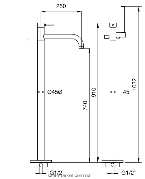 Данная модель отличается довольно заметным дизайном. Ее форма напоминает высокую букву «Г», где вертикальная часть представляет собой своеобразную цилиндрическую ногу диаметром 4,5 см и высотой 91 см. На вершине «ноги» располагается цилиндрическая ручка для регулировки подачи горячей и холодной воды, выполненная в характерном для коллекции KOBUK виде. Чуть ниже ручки под углом 90 градусов к «ноге» крепится слегка загибающийся к носику кран длиной 25 см, с круглым сечением. При этом носик крана смотрит строго отвесно к плоскости ванны и располагается от нее на расстоянии 74 см.