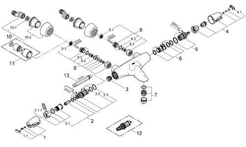 аквадиммер многофункциональный( затвор воды и регулятор расхода, переключатель ванна/душ, рукоятка аквадиммера со стопором, керамические шайбы, рукоятка выбора температуры со стопором при 38°C)