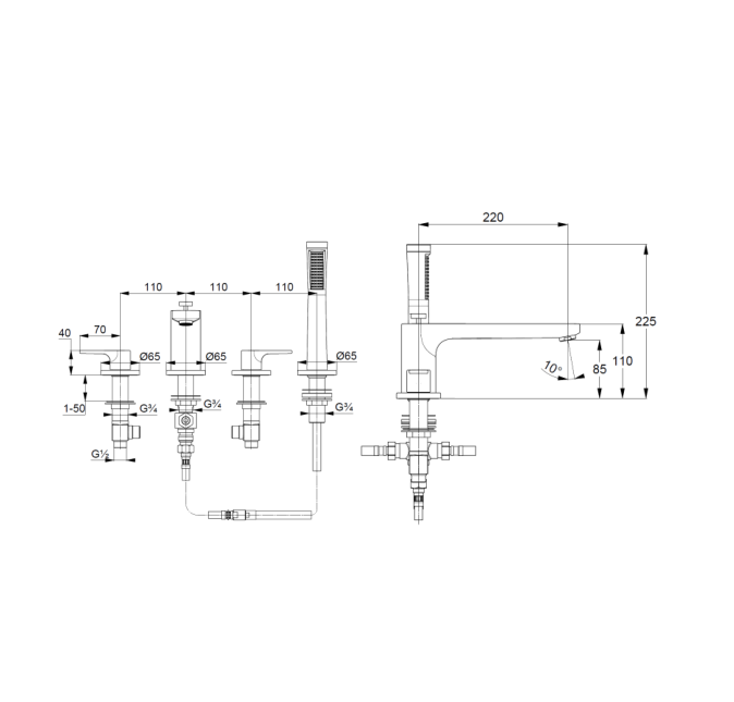 1) Смеситель на борт ванной Kludi Zenta SL на 4 отверстия с ручным душем хром