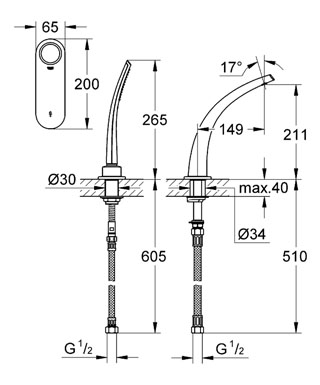 ручной душ/излив для ванны и дополнительный ручной или боковой душ, стопор безопасности при 38°CGROHE Ondus®, открытый излив на ванну, ламинарная струя GROHE Ondus®, ручной душ 27 184 000, металлический душевой шланг 2000 мм с защитой от обратного потока, электронный ограничитель расхода воды, програмируемая автоматическая система отключения (с установками по умолчанию), низковольтное электропитание 6 V DC, кабели