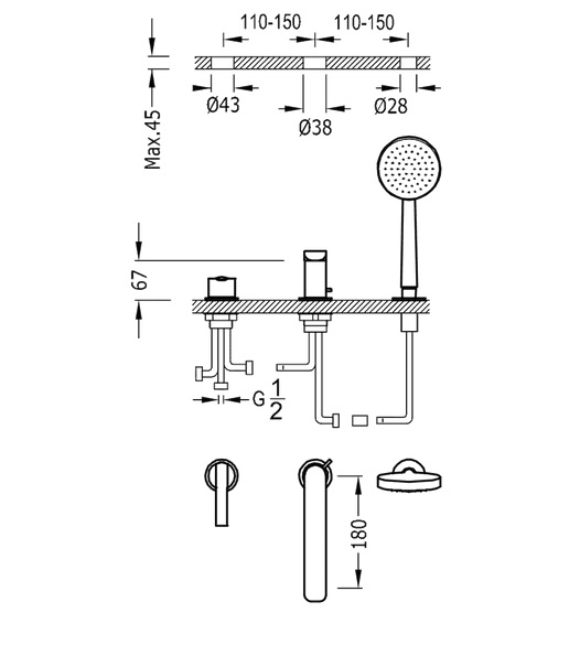 - Съемный душ с гидромассажем Ø 100 мм (5 режимов)