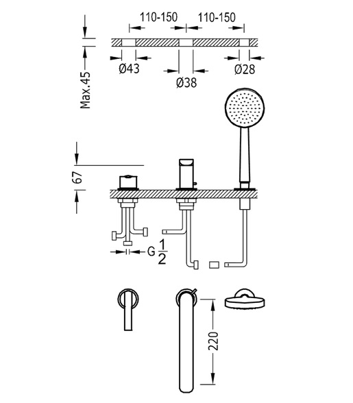- Съемный душ с гидромассажем Ø 100 мм (5 режимов)