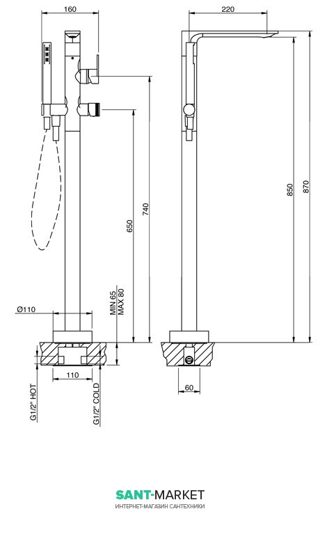 Смеситель однорычажный напольный (отдельностоящий) Treemme Ran c душевым гарнитуром хром 2203CC01