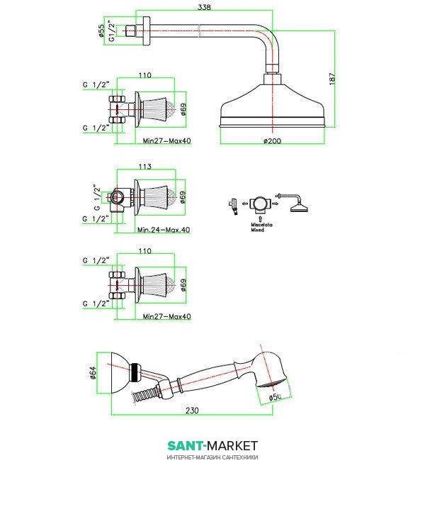 Смеситель скрытого монтажа с душевым набором(лейка,держатель,ручной душ,шланг) Fiore VENERE SKY золото/Swarovski 13OO0606
