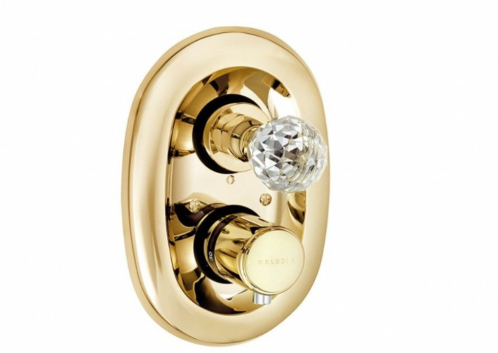 Встраиваемый термостатический смеситель для душа, с хрустальной ручкой, цвет золото 23 карата, внешняя монтажная часть.