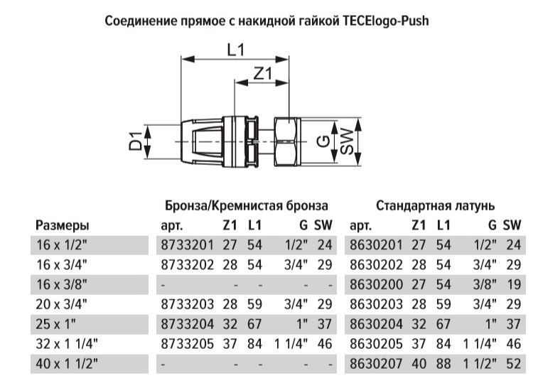 Соединение прямое TECE TECElogo-Push с накидной гайкой 16х3/8'' латунь/PPSU 8630200
