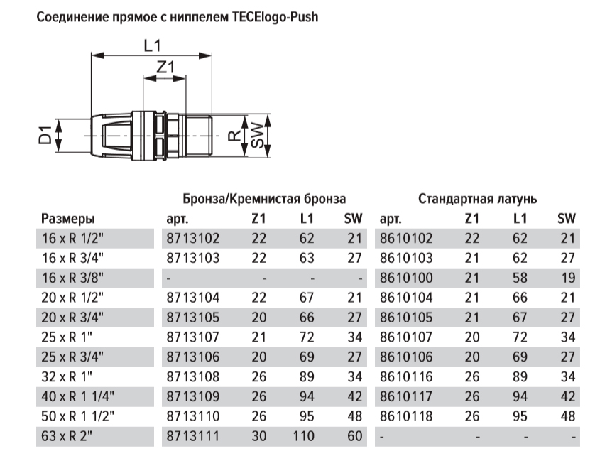 Соединение прямое TECE TECElogo-Push с ниппелем 20хR 1/2'' бронза/кремниевая бронза 8713104