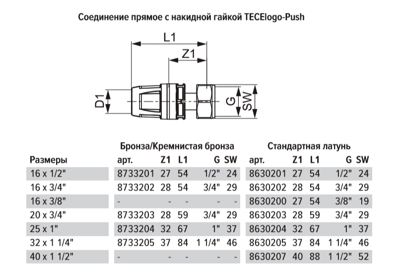 Соединение прямое TECE TECElogo-Push с накидной гайкой 25х1'' бронза/кремниевая бронза 8733204