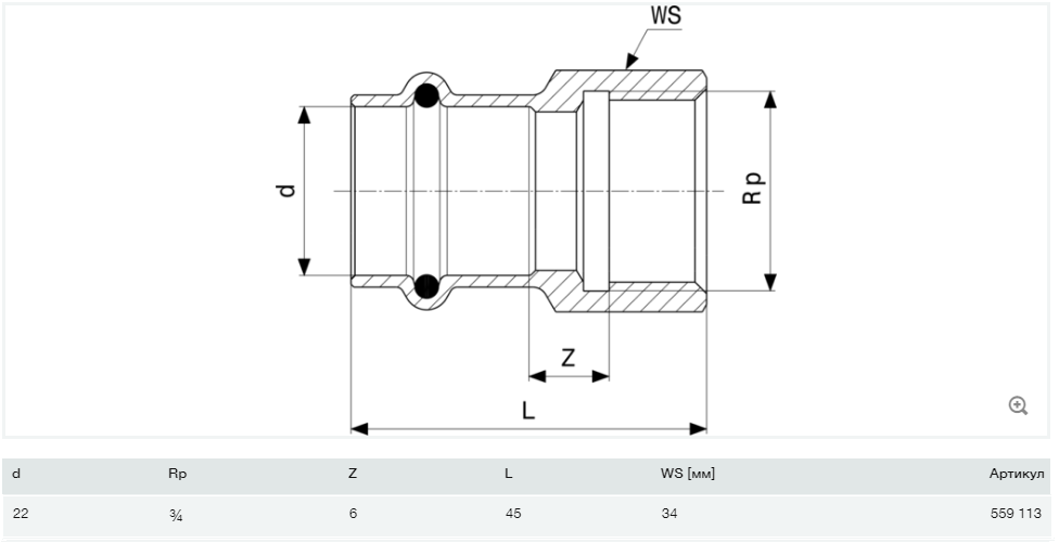 Соединительный элемент Viega Prestabo 1112 22хRp3/4 нелегированная сталь 559113