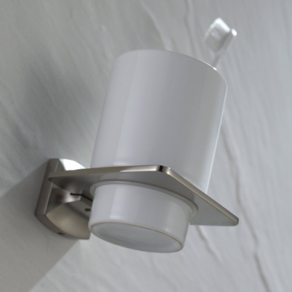 Прочная латунная конструкция с покрытием сатин крепится к стене и держит изящный керамический стакан.