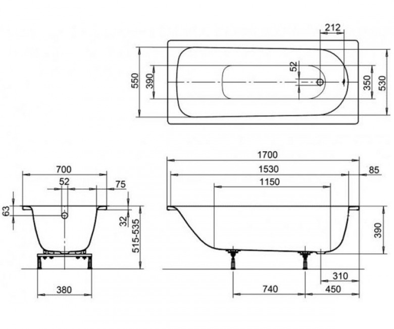 1) Стальная ванна Kaldewei Eurowa 170х70 см mod 312 белый
