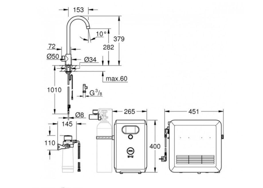 Отличительными особенностями стартового комплекта Grohe Blue Professional 31302002 являются: