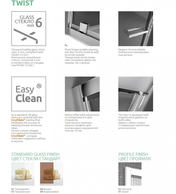 - на все стекла стандартно наносится покрытие Easy Clean, которое помогает содержать кабину в чистоте. Защитное покрытие Shower Guard с пожизненной гарантией — дополнительная опция.