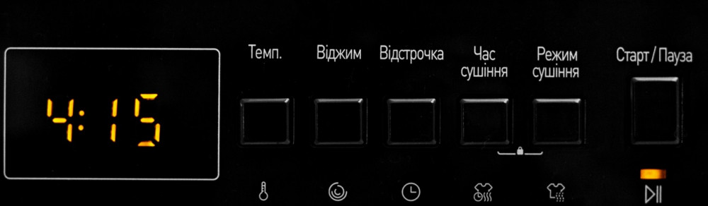 выбор температуры, выбор скорости отжима, отложенный запуск, уровень сушки, время сушки, отложенный запуск, блокировка от детей