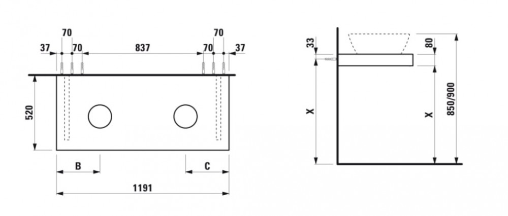 Столешница Laufen Case 1191х520х80 мм с вырезом справа и слева МДФ белый матовый