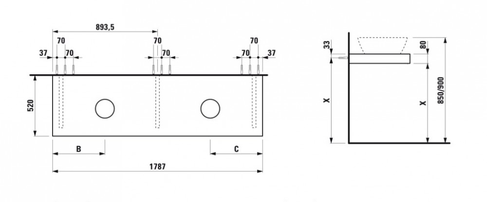 Столешница Laufen Case 1787х520х80 мм с вырезом справа и слева МДФ светлый дуб H4051640755191