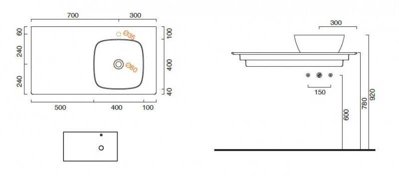 Столешница под раковину Catalano Green Lux 40 монтаж раковины справа, особенности: