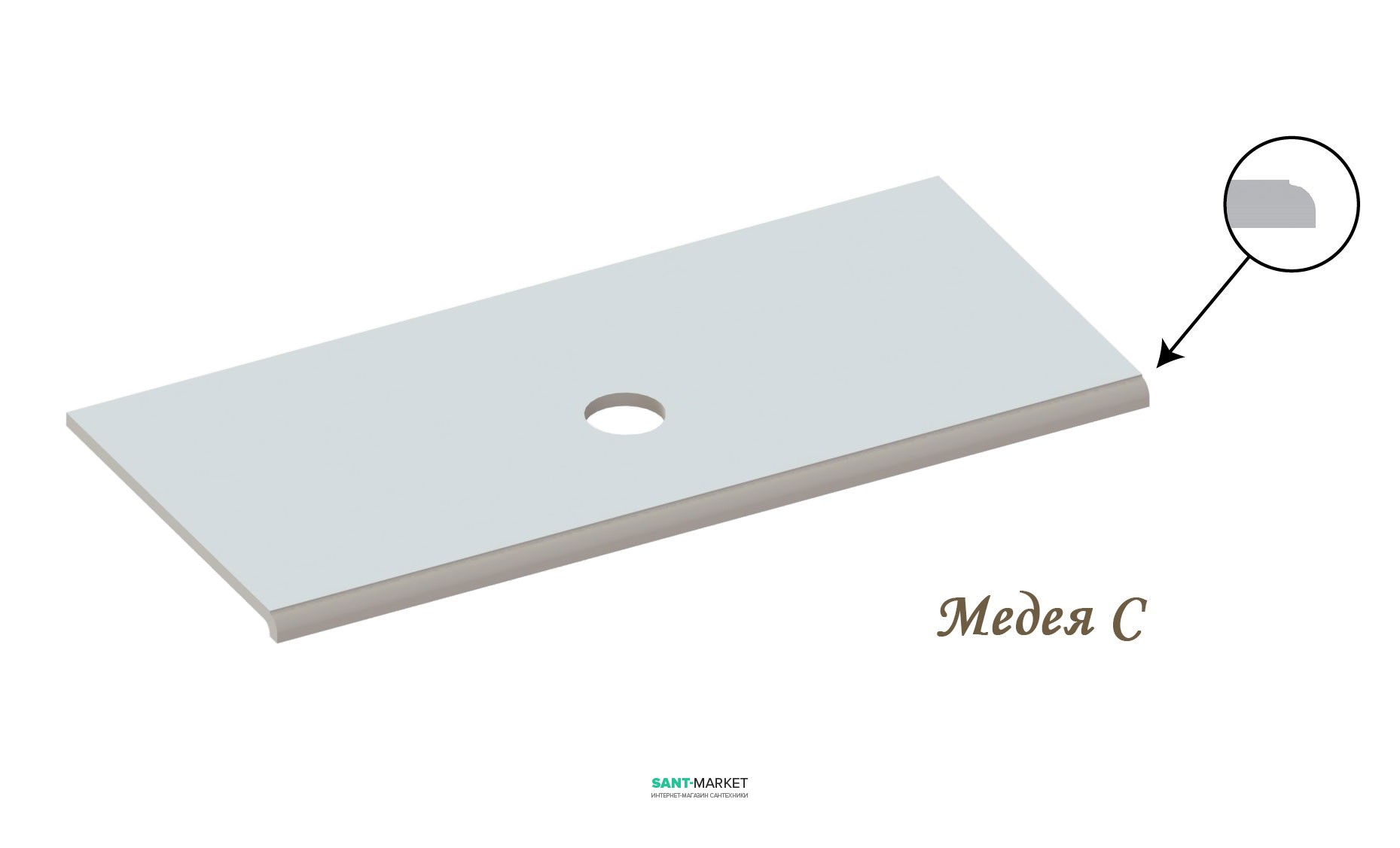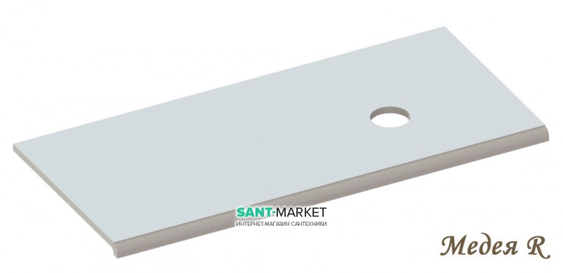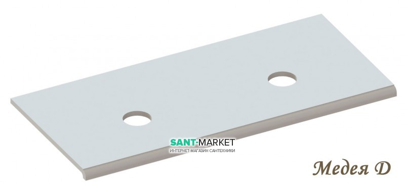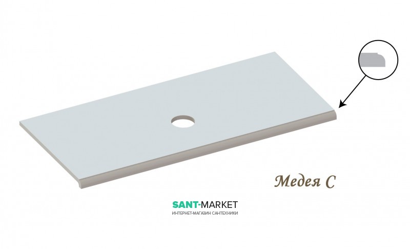 Столешница «Медея» 900/550 имеет прямоугольную форму с разными вариантами установки умывальника. На столешницу возможно установить умывальник в четырёх вариантах: установка умывальника по центру столешницы, установка умывальника справой или с левой стороны столешницы, а так же возможно установить сразу 2 умывальника на одну столешницу (если позволяют размеры умывальника устанавливать пару на выбранном размере столешницы). Столешница «Медея» 900/550 имеет необычную форма капиноса, что выделяет её из ряда других столешниц под умывальники, выглядит она привлекательно, очаровательно, дорого и является практичным и функциональным решением в оформлении ванной комнаты. Качественная столешница для ванной непроницаема для воды и пара, поэтому о проблемах деформирования поверхности можно забыть. По тактильному комфорту столешница из искусственного камня также выигрывает у холодного мрамора и гранита. Смотрятся они очень дорого и эффектно, а по цене намного доступнее столешниц из натурального камня. Изделия из литого мрамора не имеют пор, микротрещин и соединительных линий, следовательно, легко моются, не впитывают грязь и запахи. Искусственный камень также обладает высокой стойкостью к термическим и химическим воздействиям, что делает столешницу из этого материала долговечной и удобной в эксплуатации.