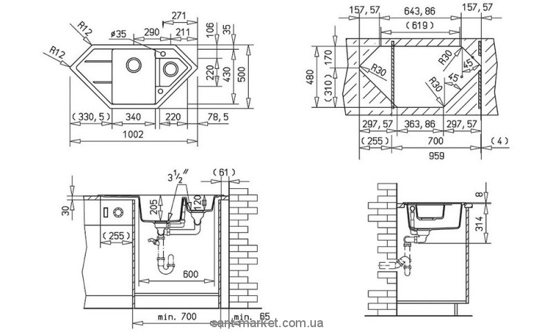 - Комплектация: мойка, 3 ½ вентиль-эксцентрик с переливом