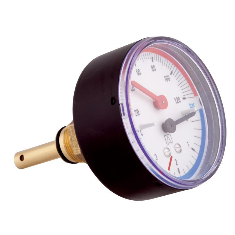 Термоманометр TM80 в металлическом корпусе с монтажным клапаном. Термоманометр используется для одновременного измерения температуры и давления изучаемой среды. В комплекте с термоманометром предусмотрен монтажный клапан, позволяющий изменить термоманометр, не требуя слива теплоносителя с установки.