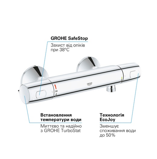 Семьи оценят две отличные функции безопасности: кнопка GROHE SafeStop ограничивает температуру до 38°C, чтобы предотвратить ошпаривание, а технология GROHE CoolTouch гарантирует, что кран никогда не станет слишком горячим.