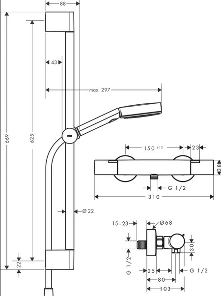 - состоит из: ручной душ, термостат для душа, душевая штанга, ползунок, душевой шланг.