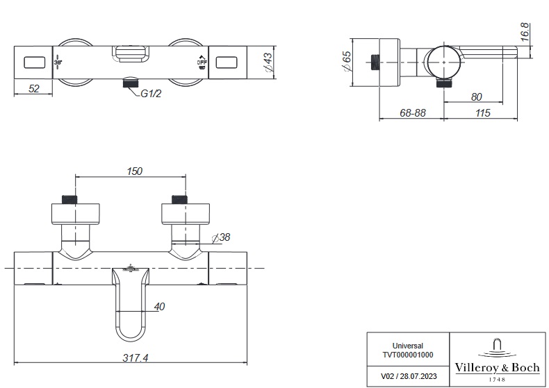 Термостат для ванной Villeroy & Boch Universal Taps & Fittings двухвентильный матовое золото TVT00000100076