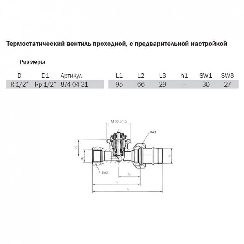1) Термостатический вентиль проходной с предварительной настройкой Tece TECEflex латунь
