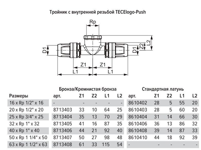 Тройник TECE TECElogo-Push с внутренней резьбой 63хRp 1 1/2''х63 бронза/кремниевая бронза