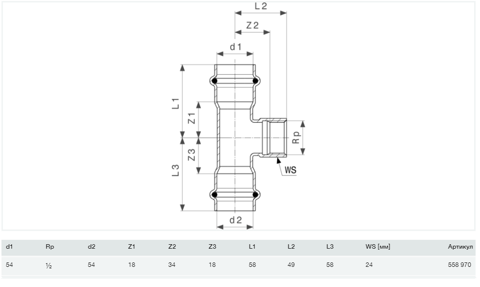 1) Тройник Viega Prestabo 1117.2 54хRp1/2х54 нелегированная сталь