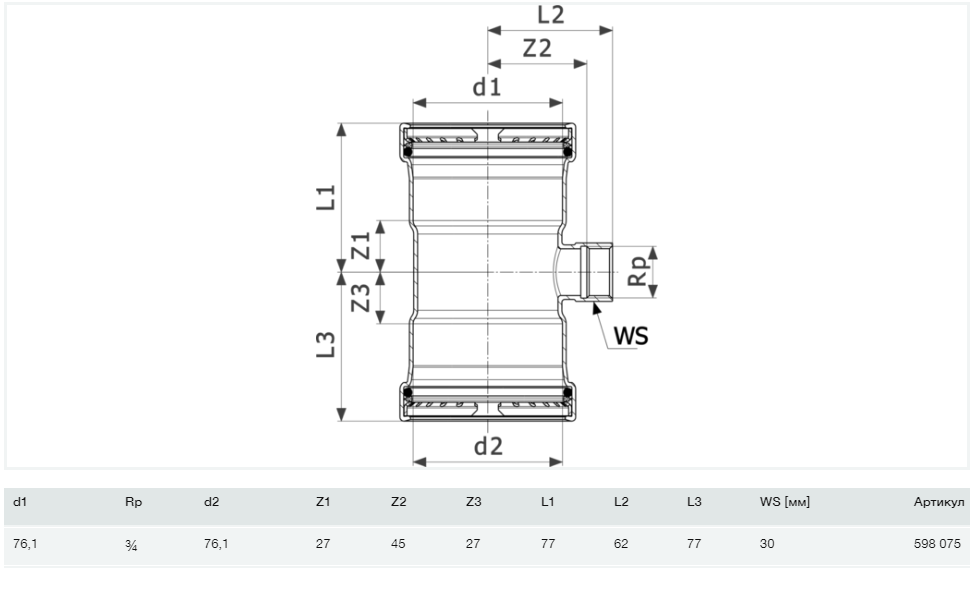 1) Тройник Viega Prestabo XL 1117.2XL 76.1хRp3/4х76.1 нелегированная сталь