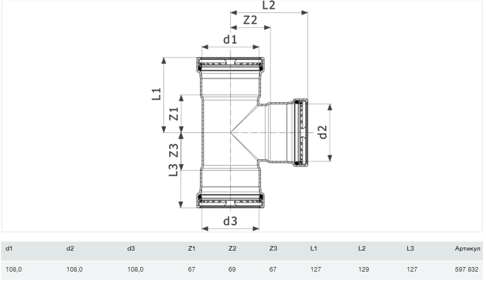 1) Тройник Viega Prestabo XL 1118XL 108 нелегированная сталь