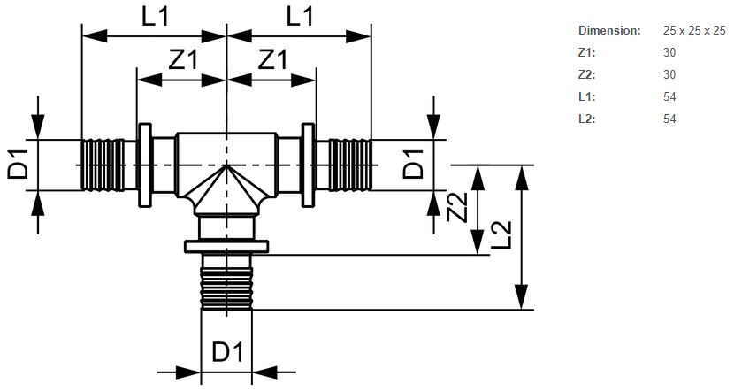 Тройной резьбовой фитинг TECE TECEflex 90° равнопроходной 25х25х25 латунь 760025