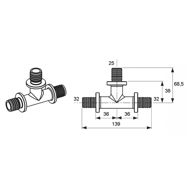 Тройной резьбовой фитинг TECE TECEflex 90° редукционный 32х25х32 латунь 710523
