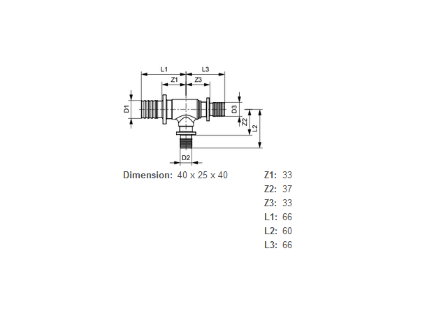 Тройной резьбовой фитинг TECE TECEflex 90° редукционный 40х25х40 латунь 760533
