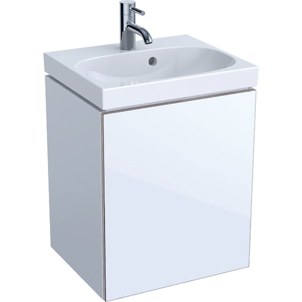 1) Тумба для раковины Geberit Acanto с одной дверью и сифоном ДСП белый ультраглянцевый/белое глянцевое стекло